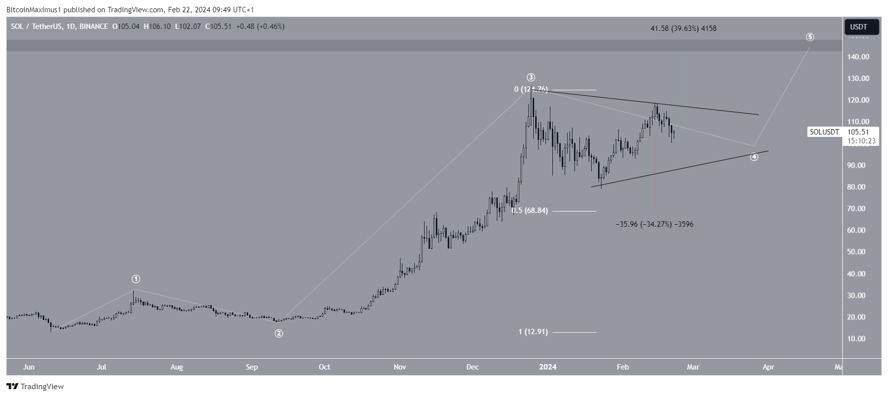 Se a contagem estiver correta, a SOL continuará se consolidando no triângulo antes de um eventual rompimento. Se isso acontecer, um salto de quase 40% para a próxima resistência em US$ 145 poderá ocorrer.