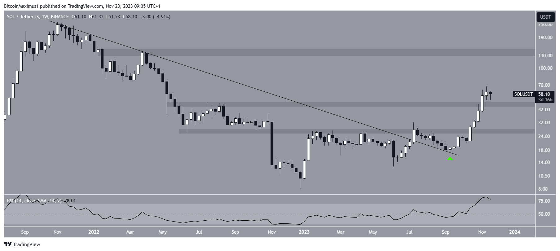 No entanto, a SOL acelerou posteriormente a sua taxa de aumento. Antes da vela semanal de baixa da semana passada (ícone vermelho), a SOL havia criado cinco velas sucessivas de alta. Até agora, a SOL atingiu uma nova máxima anual de US$ 68,20.