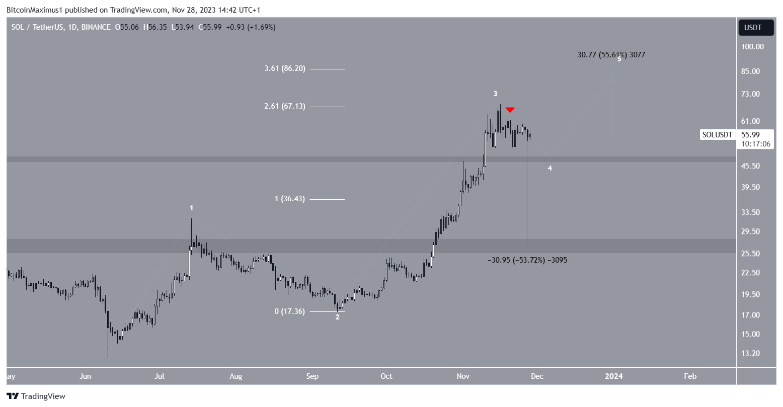 Se a contagem estiver correta, a SOL aumentará novamente após completar a onda quatro. Uma meta potencial para o topo da onda cinco é US$ 86, um aumento de 55% em relação ao preço atual.