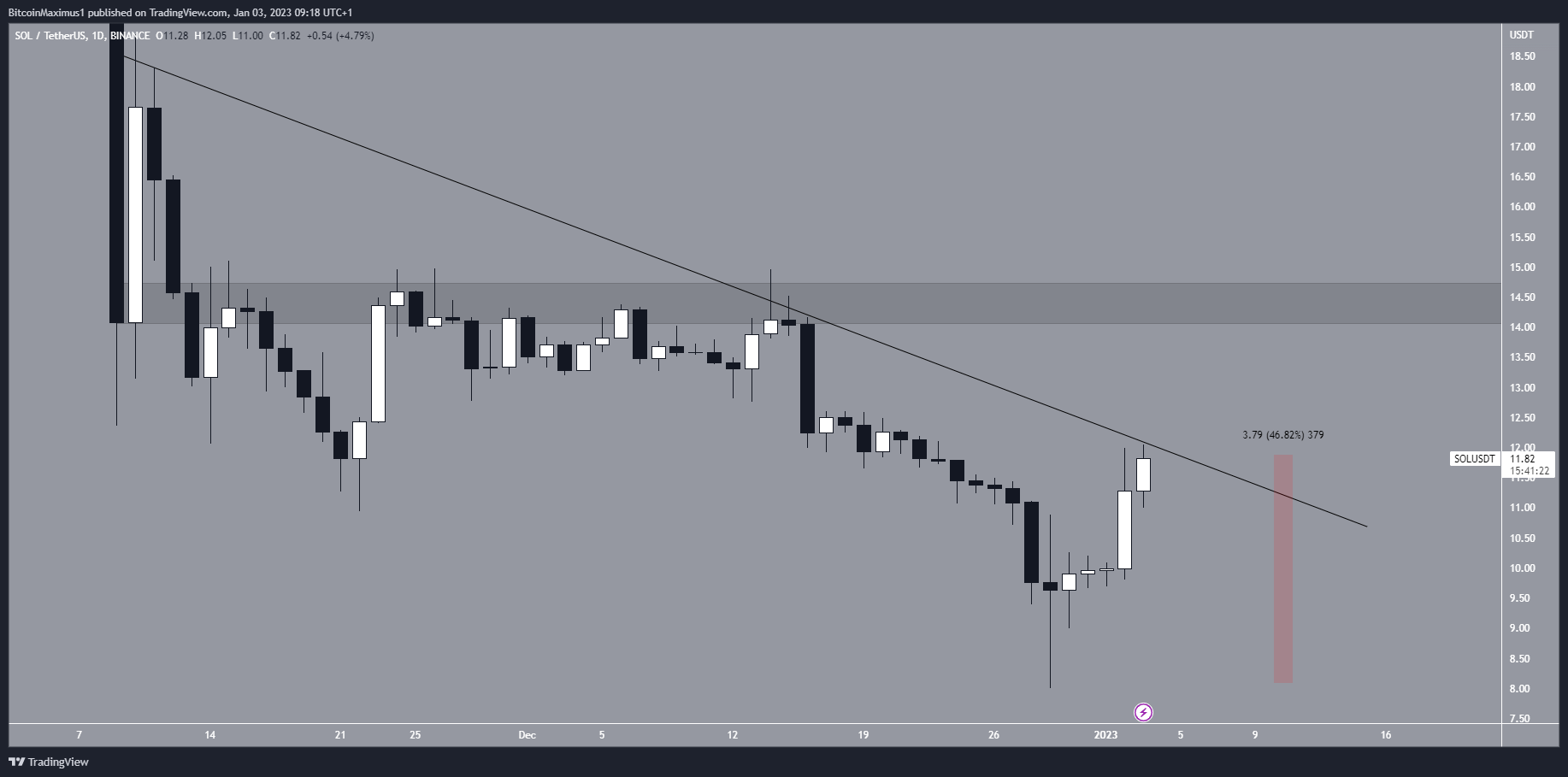 A equipe de análises do BeInCrypto destacou nesta terça-feira (3) que o SOL está seguindo uma linha de tendência de baixa desde 9 de novembro. A alta dos últimos dias empurrou o preço para próximo dessa linha, com um eventual rompimento podendo levar o token para o nível de US$ 14,50.