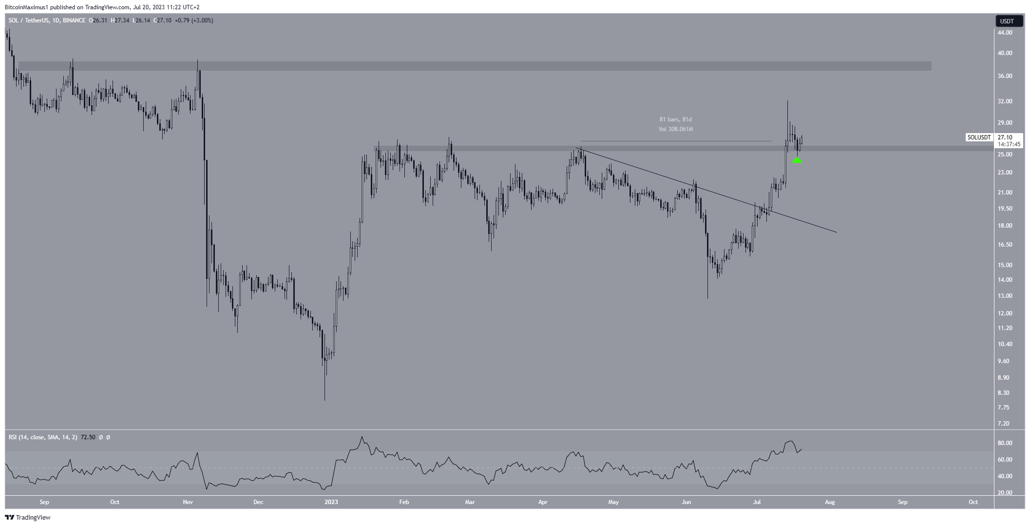 Isso se alinha com as leituras de alta do gráfico semanal. O cenário de alta foi ainda mais reforçado quando o preço da Solana recuperou a área horizontal de US$ 26, que agora deve atuar como um nível de suporte (ícone verde). Em 14 de julho, o preço atingiu uma nova máxima anual de US$ 32,13. Embora tenha retrocedido posteriormente com um longo pavio superior, ainda permanece acima da área de US$ 26.