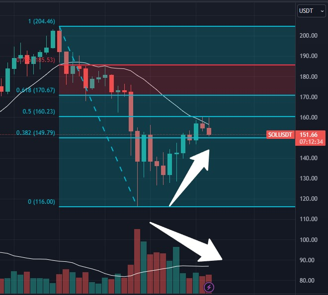 Fernando Pereira, analista da Bitget, está pessimista quanto os movimentos futuros da SOL. Segundo ele, o baixo volume visto durante o movimento de alta da semana passada mostra que os compradores não têm força para buscar novos topos.