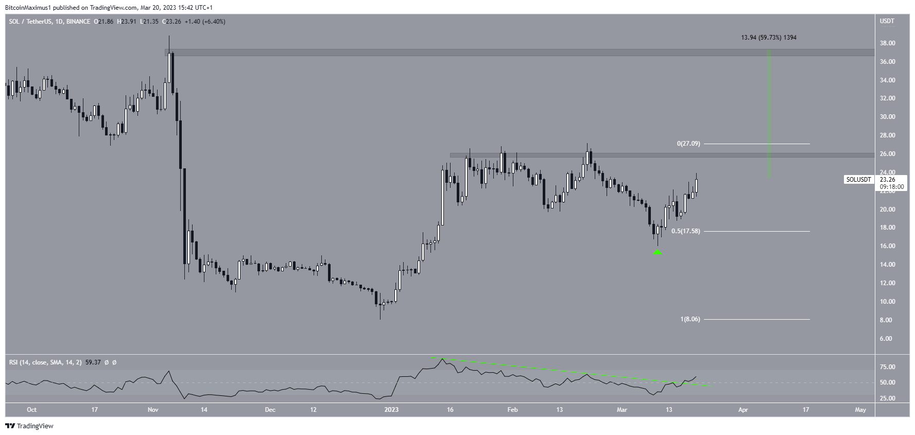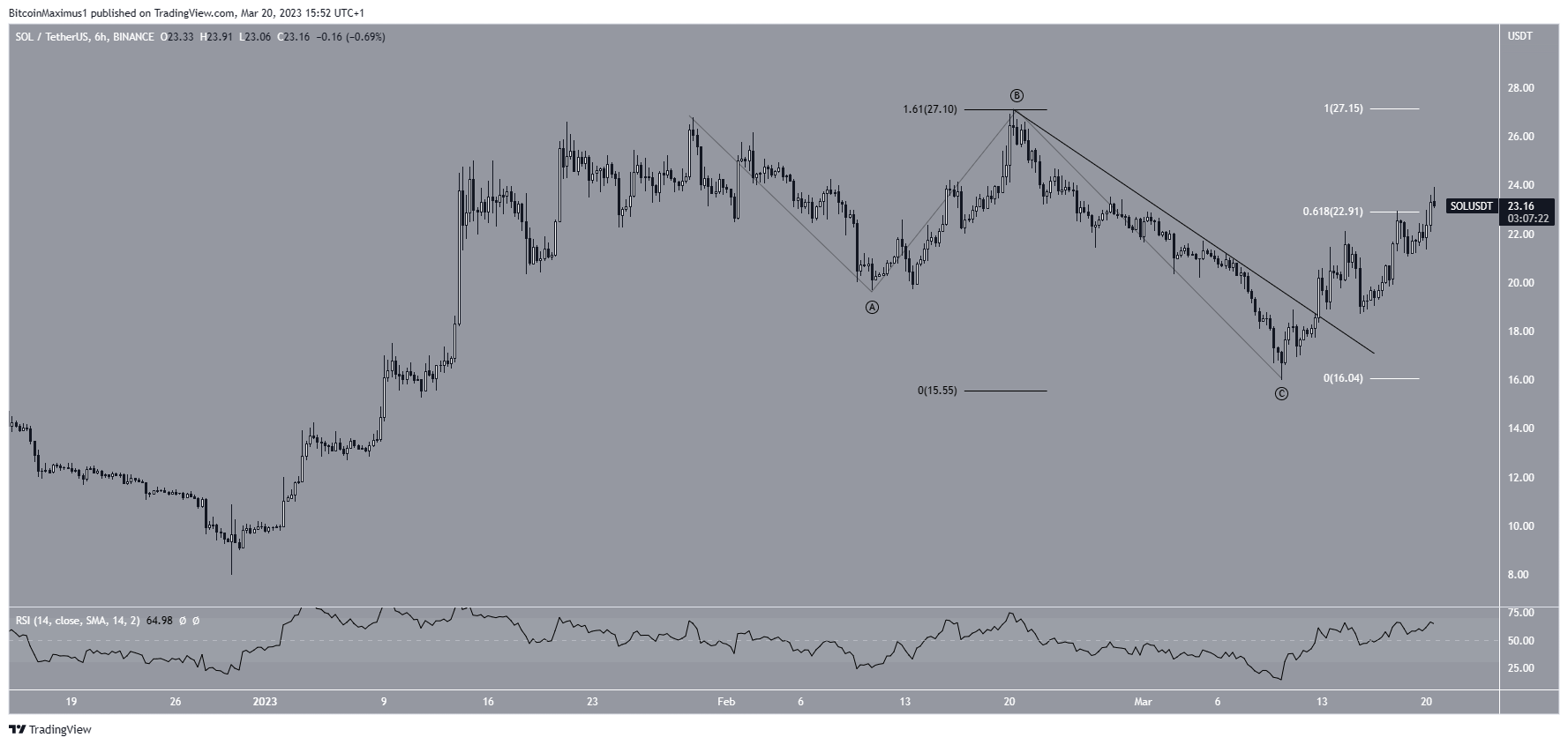Em primeiro lugar, a SOL saiu de uma linha de resistência descendente. Após, conseguiu mover-se acima do nível da resistência de retração 0,618 de Fibonacci (branco) em US$ 22,91.