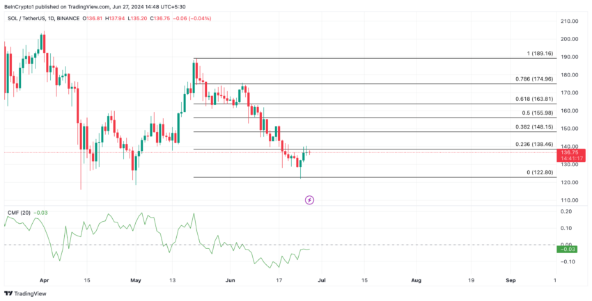 Para os traders que apostam na alta da SOL, é importante ressaltar que a altcoin continua correndo o risco de sofrer uma queda de preço ainda maior. As leituras de seu Chaikin Money Flow (CMF) mostram uma saída constante de liquidez de seu mercado à vista.