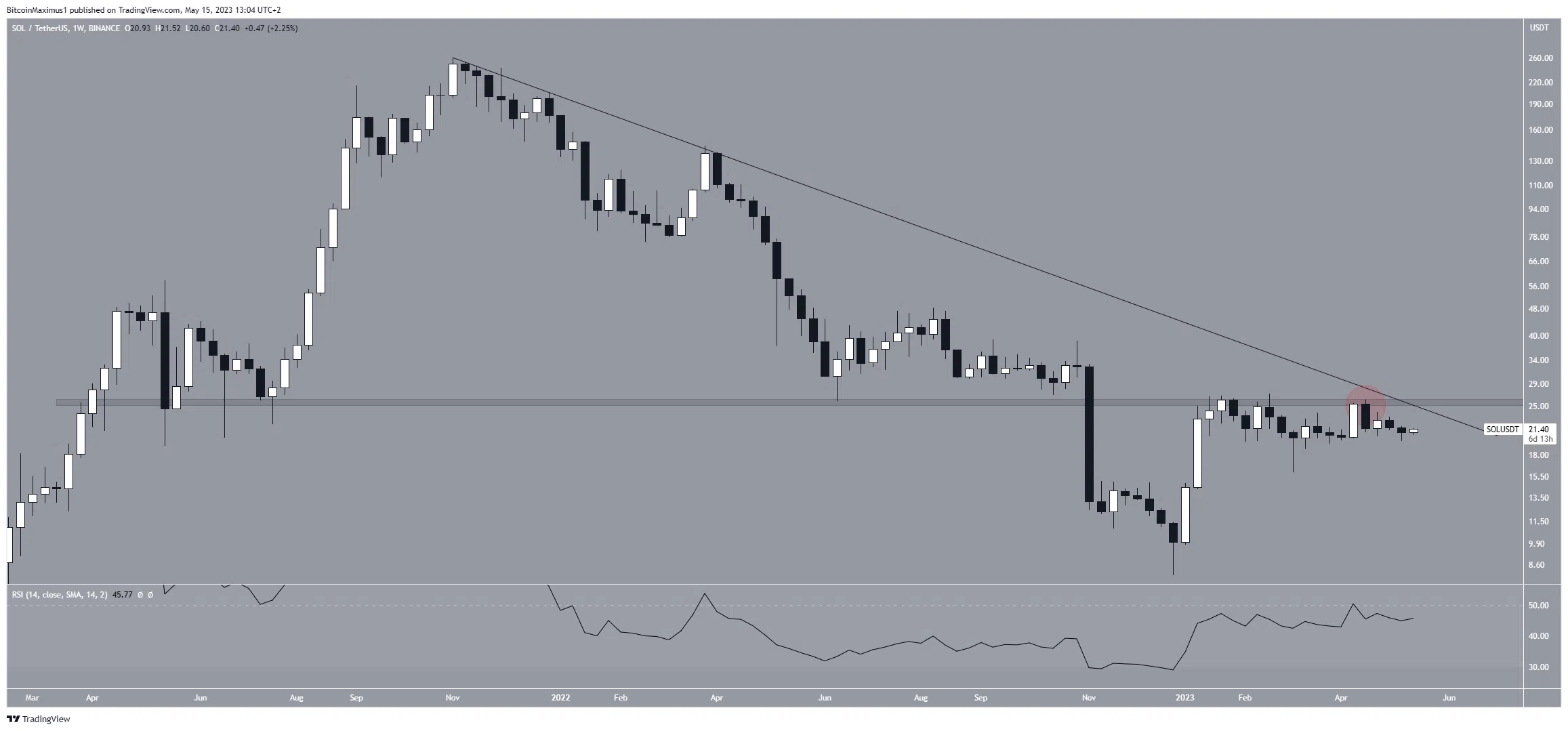 A SOL caiu sob uma linha de resistência descendente de longo prazo desde que atingiu seu recorde de preço em novembro de 2021. Como a linha está em vigor há tanto tempo, a tendência pode ser considerada de baixa, desde que a SOL negocie abaixo dela.