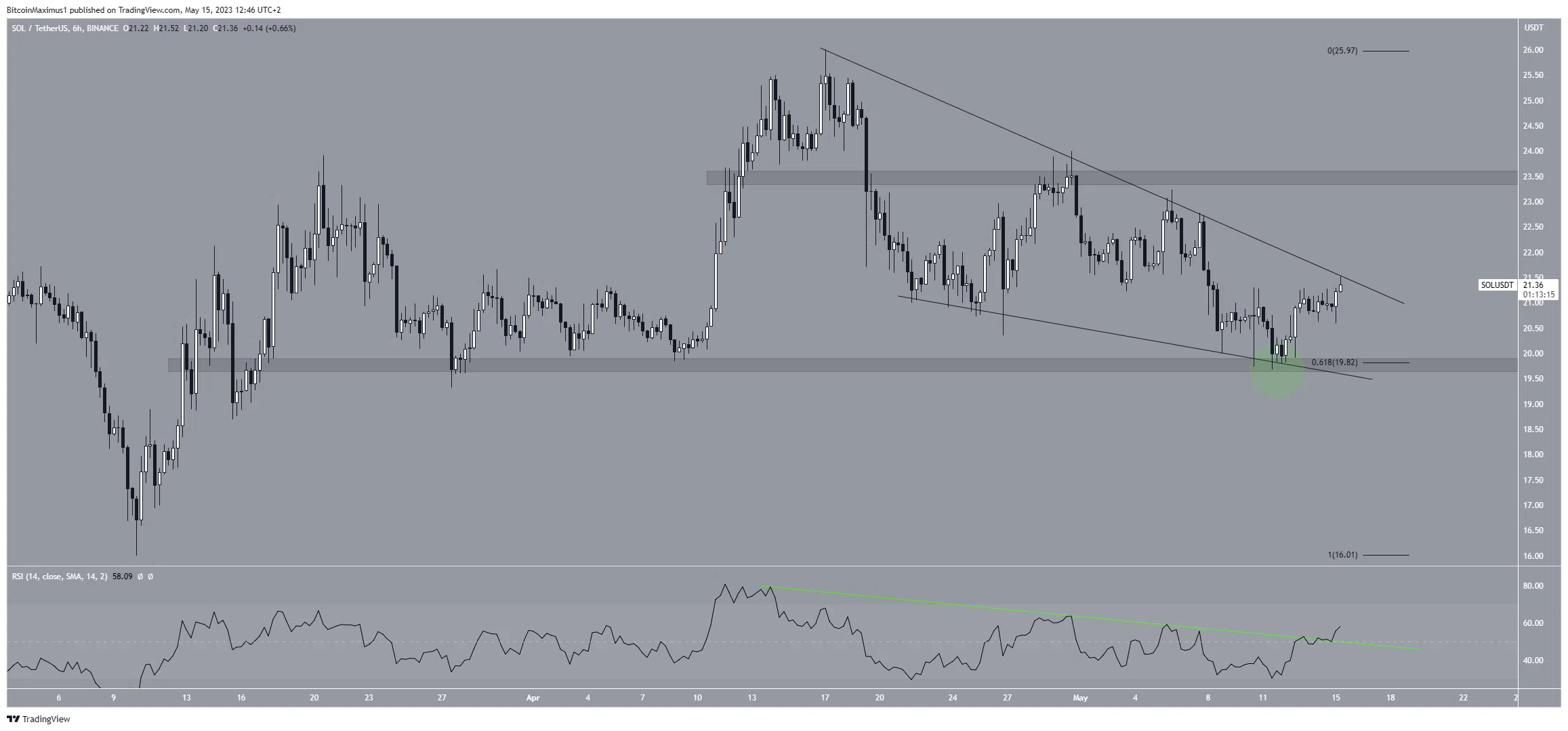 A análise técnica e a ação do preço no gráfico de seis horas mostram que a SOL caiu dentro de uma cunha descendente desde 16 de abril. A cunha descendente é considerada um padrão de alta, o que significa que leva a uma quebra na maioria das vezes.