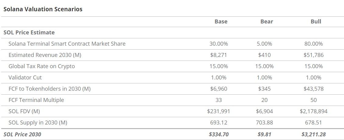 A gestora de ativos também assume que a SOL monetiza apenas 20% da taxa de aquisição do Ethereum e alcança menos da metade das quotas de mercado do ETH devido a uma diferença fundamental na filosofia da comunidade.