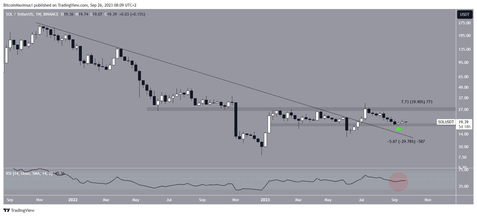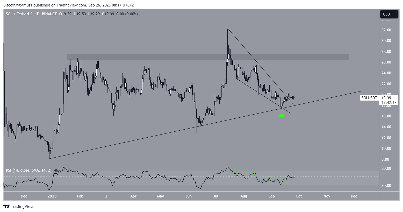 Apesar desta previsão de alta do preço da SOL, um rompimento da linha de suporte ascendente provavelmente causará uma queda de 30% até a linha de resistência descendente de longo prazo perto de US$ 14.