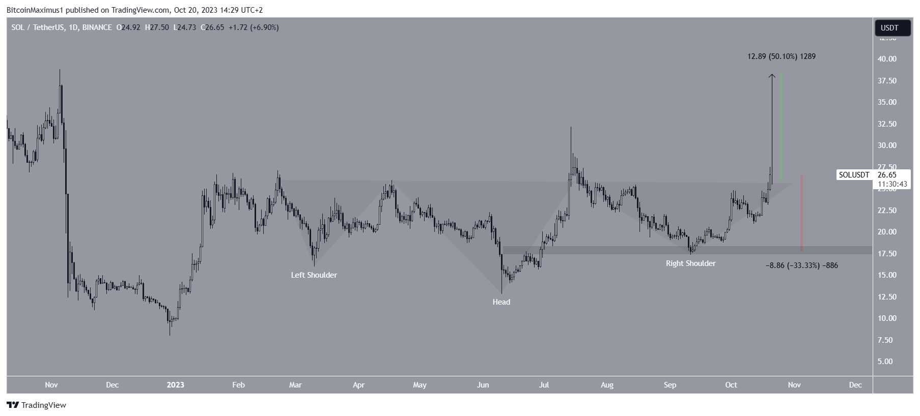 O gráfico diário mostra que a Solana estava em um padrão inverso de cabeça e ombros desde fevereiro. O padrão é considerado de alta, geralmente gerando rompimentos acima dele.