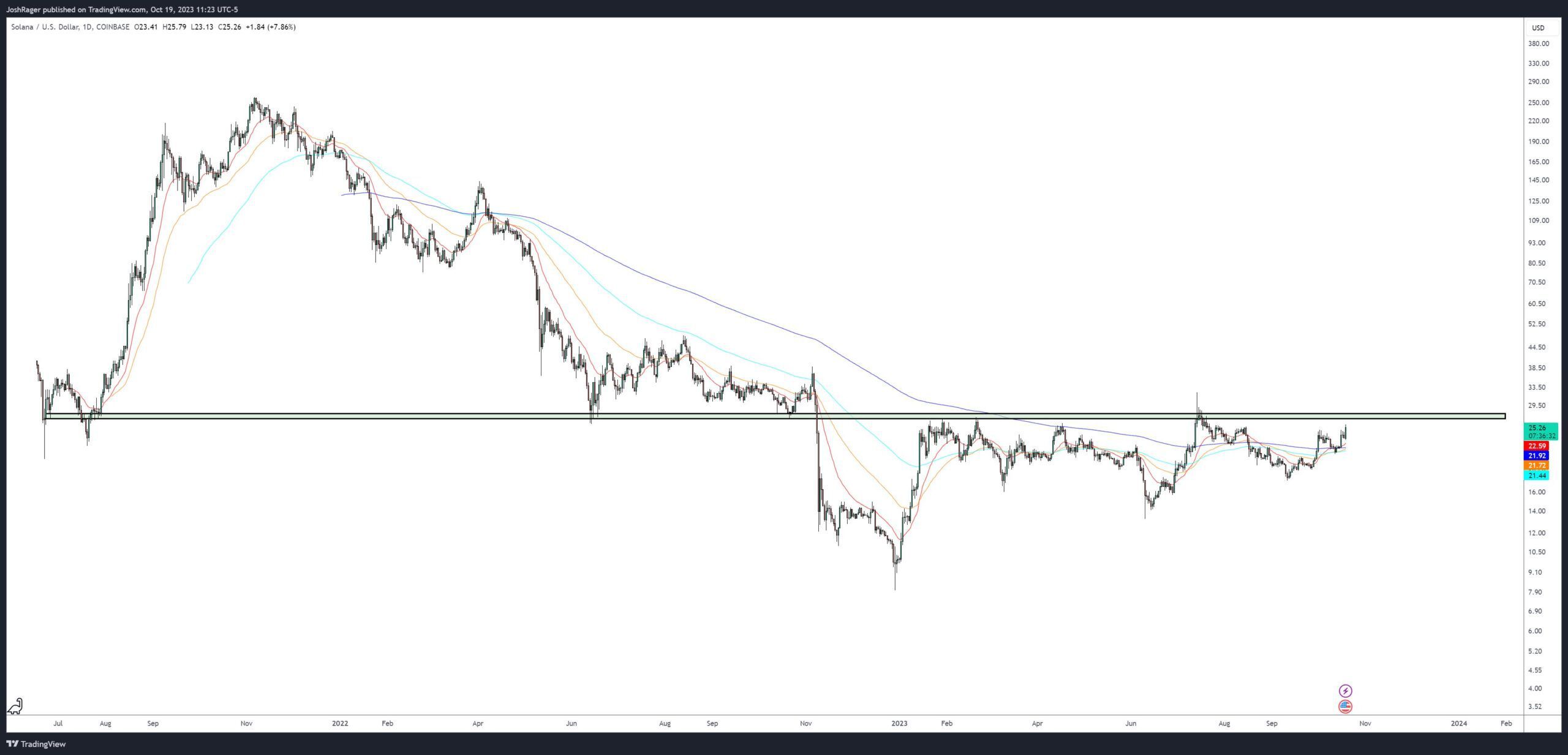Hoje, a SOL está em processo de rompimento do padrão. Um fechamento diário acima de US$ 26 confirmará este cenário.