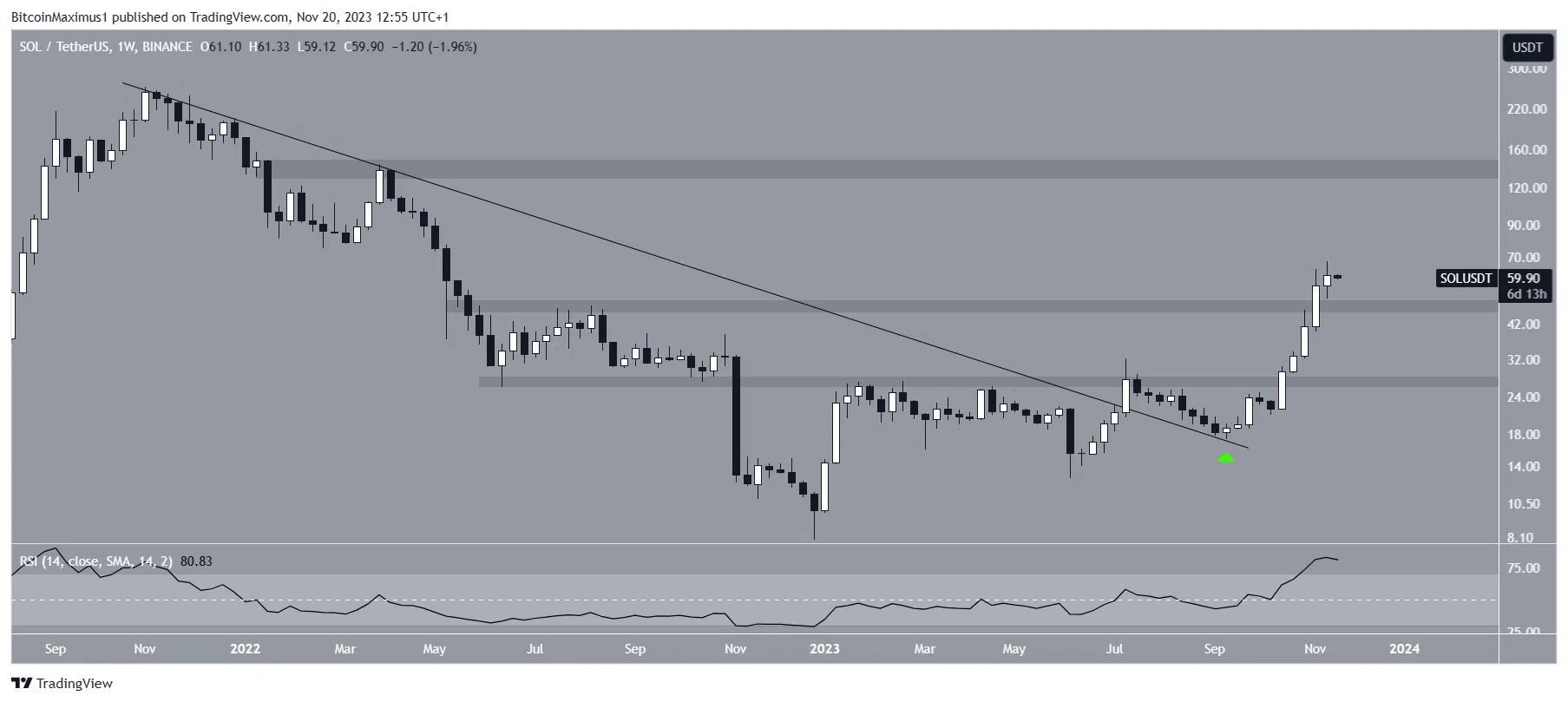 A SOL tem apresentado um forte movimento de alta desde o início de outubro. Na época, o token havia rompido e validado uma linha de tendência de baixa como suporte (ícone verde).