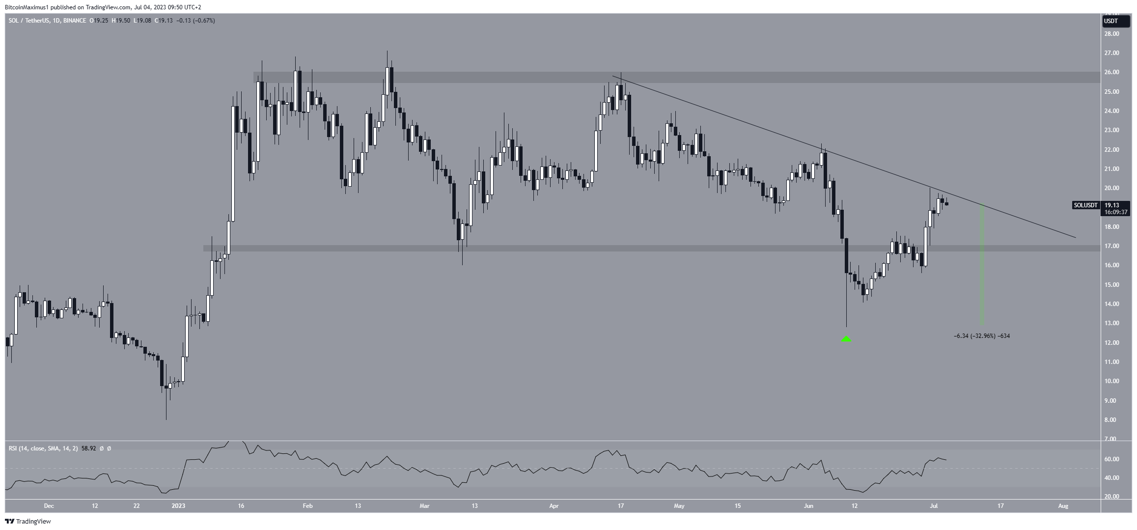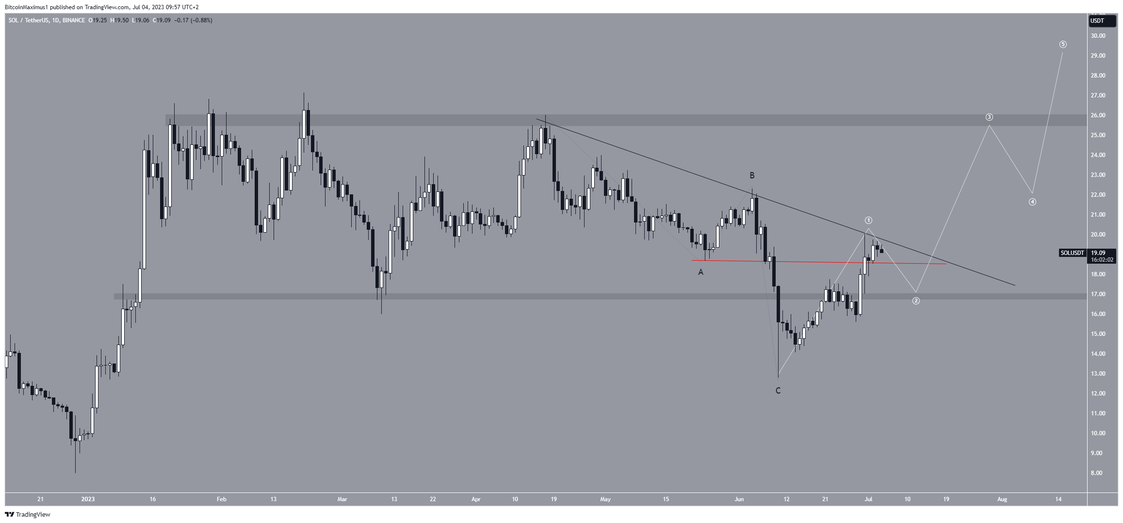 Portanto, se a contagem estiver correta, o preço da SOL iniciou um movimento de alta em 10 de junho (branco) e acabará saindo da linha de resistência. Provavelmente atingirá a próxima resistência em US$ 26, se isso acontecer.