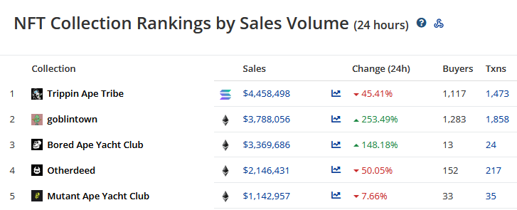 O CryptoSlam observou que após o lançamento da coleção Trippin ‘Ape Tribe, na terça-feira (24), o volume de vendas de NFTs da Solana aumentou em mais de 400%. Disponível no Magic Eden, maior marketplace da rede, a coleção se assemelha ao Mutant Ape Yacht Club, do ecossistema BAYC.