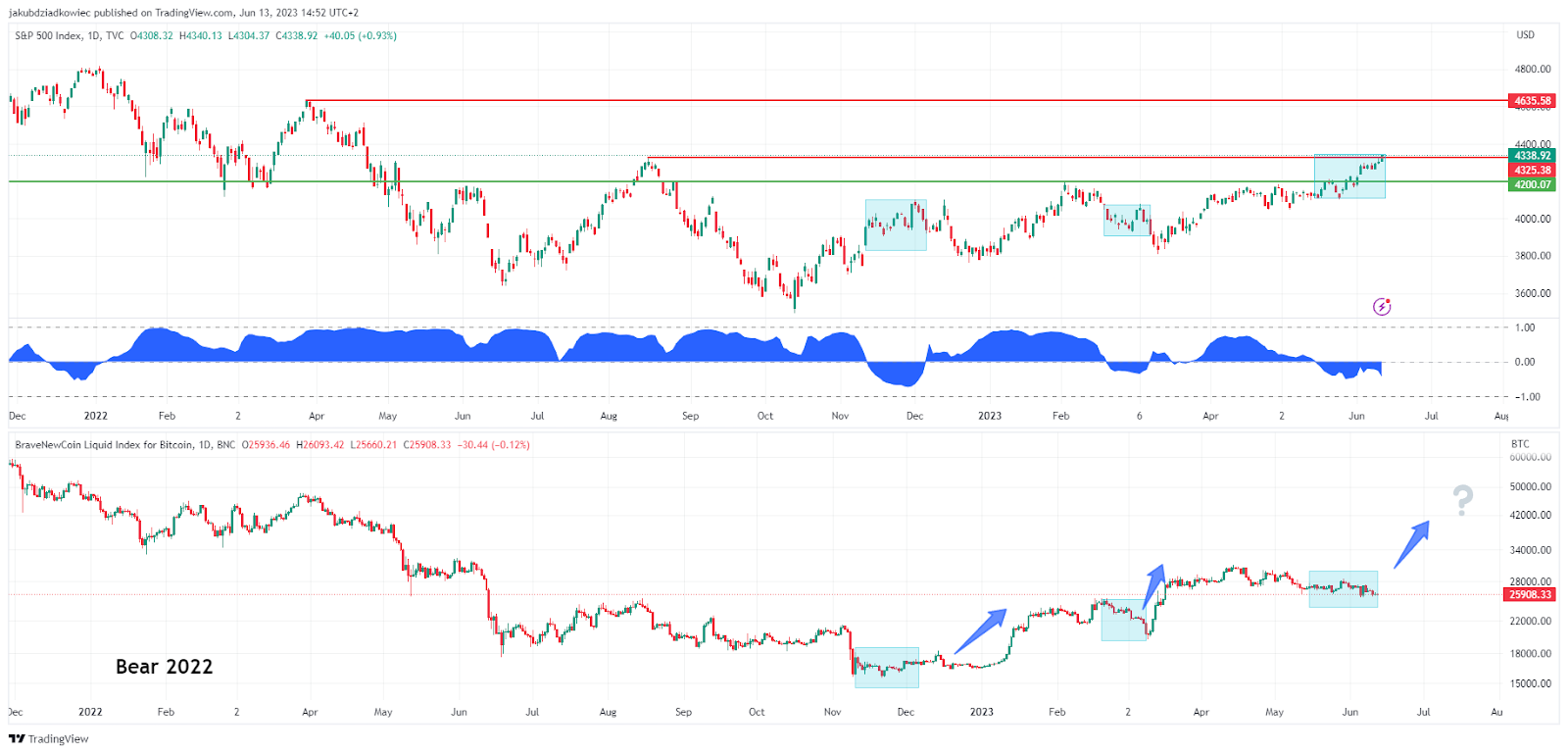 Finalmente, estamos vendo uma correlação negativa novamente desde meados de maio. O SPX está aumentando e rompendo um importante nível de resistência. Ao mesmo tempo, o Bitcoin está preso em um movimento lateral e ligeiramente descendente. Se a situação for semelhante aos dois casos anteriores, pode-se esperar que o mercado de criptomoedas siga os passos dos ativos tradicionais.