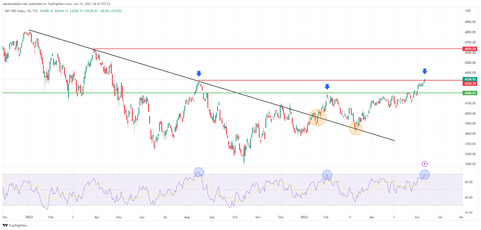 Desde então, o SPX iniciou uma tendência de alta e subiu 24% para a avaliação de US$ 4.338 registrada nesta terça-feira. No início de 2023, a linha de tendência de baixa (preta) foi rompida e posteriormente validada como suporte (círculos laranja).
