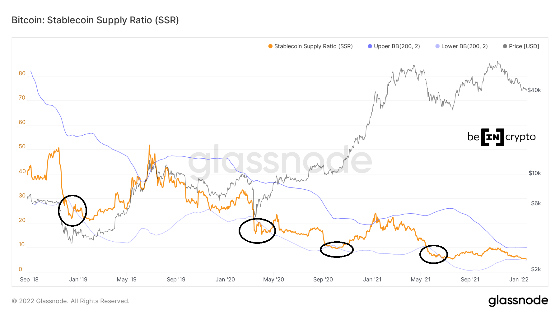Uma análise dos indicadores on-chain para o Bitcoin (BTC), mais especificamente o Stablecoin Supply Ratio (SSR), que atingiu um novo mínimo histórico.