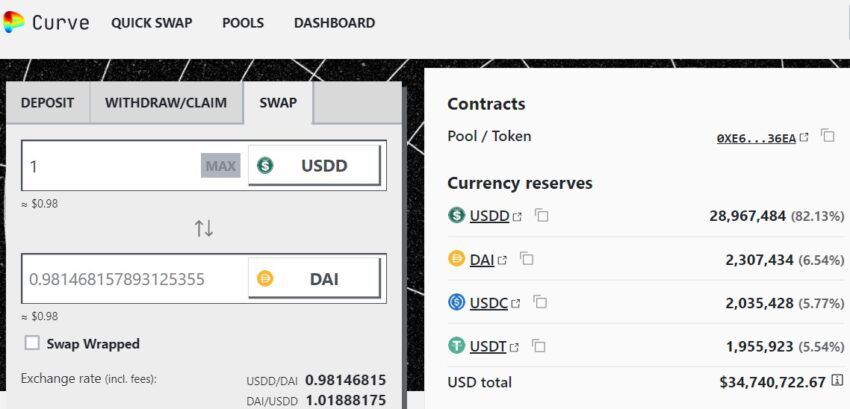 Até o momento, o USDD representa cerca de 82% das reservas da pool USDD/3CRV sob o protocolo Curve Pool DeFi, abaixo de um valor anterior de 86%. A perda de paridade é prejudicial para a troca de outros ativos DeFi como DAI ou USDC com o USDD.