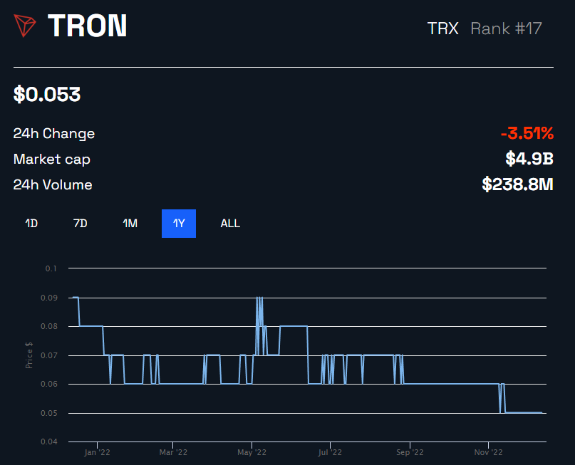 Nesta segunda-feira (12), caiu para uma mínima local de US$ 0,97 antes de se recuperar para US$ 0,98. Enquanto isso, o ativo TRX da TRON também está em queda, mostrando uma desvalorização de preço de mais de 3,5% no dia.