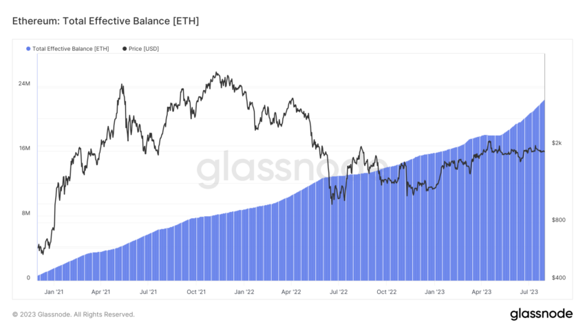 De fato, os dados da Glassnode mostram que mais de 22 milhões de ETH estão em stake e quase 4 milhões de ETH em recompensas de staking foram distribuídas, no valor de US$ 44 bilhões e US$ 8 bilhões, respectivamente.