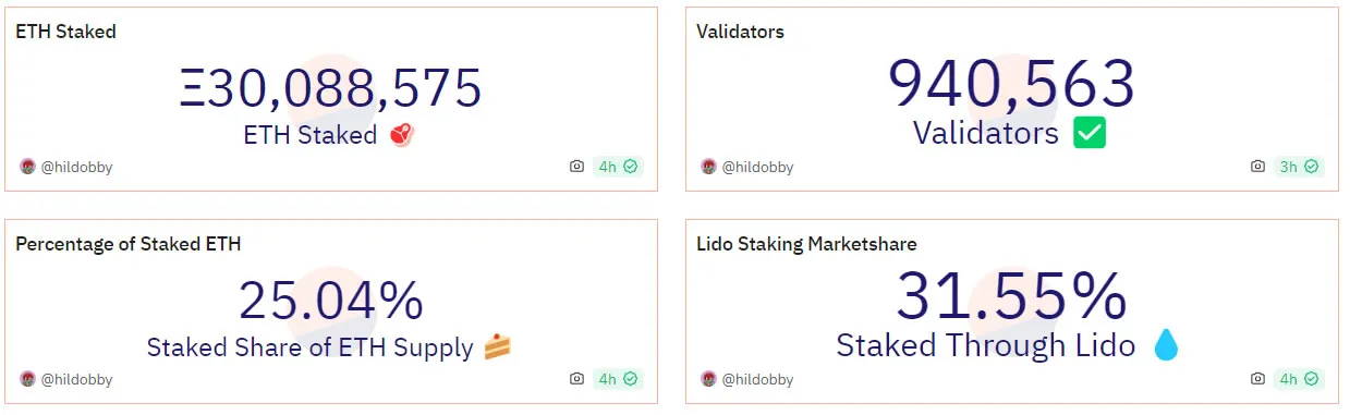 Nesta quinta-feira (8), a plataforma de staking líquido Lido compartilhou os dados de que 25% de toda a oferta de ETH atual está depositada nesta atividade.