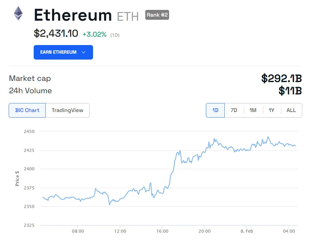 O Ethereum acumula alta de 3% nas últimas 24 horas, atingindo a marca de US$ 2.431 durante esta quinta-feira. O ativo está sendo negociado atualmente com alta de 7,8% na semana. No entanto, está se aproximando rapidamente dos níveis de resistência e ainda está abaixo de sua máxima anual de US$ 2.700 registrada em 12 de janeiro.