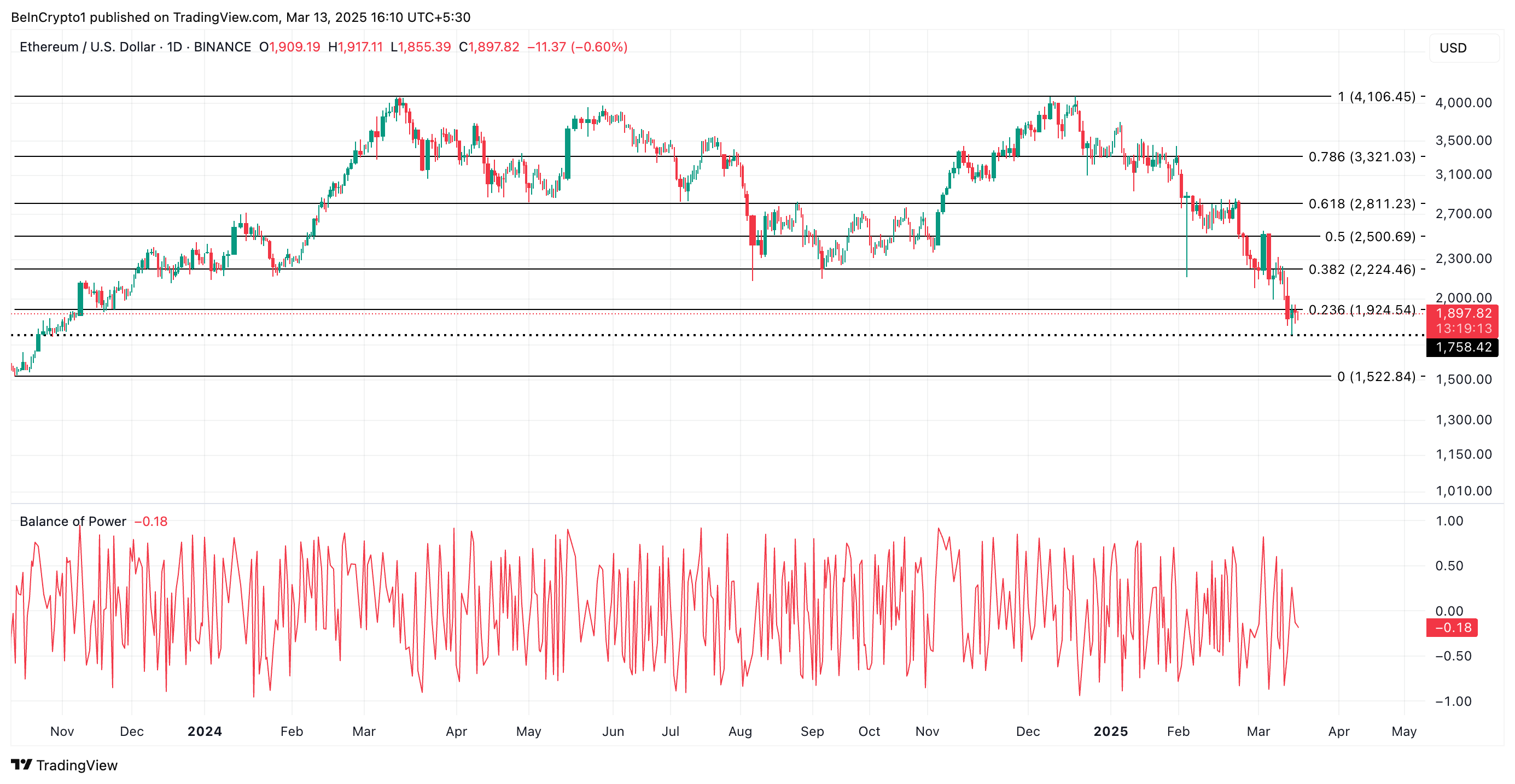 O ETH está sendo negociado a US$ 1.897 até o fechamento desta publicação, rompendo abaixo do suporte chave formado em US$ 1.924. As leituras negativas de seu Balance of Power (BoP) refletem a atividade de venda contínua entre os detentores da moeda.
