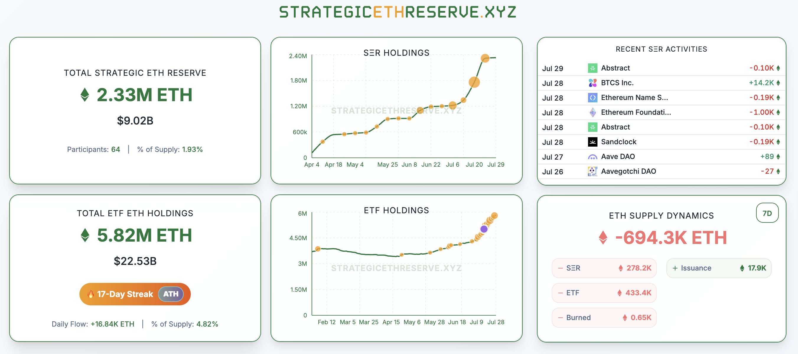 O BeInCrypto relatou anteriormente que empresas estão acelerando seus esforços para adquirir ETH como parte de sua estratégia de tesouraria. De acordo com os dados mais recentes, a Reserva Estratégica de ETH, que rastreia entidades que possuem Ethereum em suas tesourarias, agora totaliza 2,33 milhões de ETH, avaliados em mais de 9 bilhões de US$.