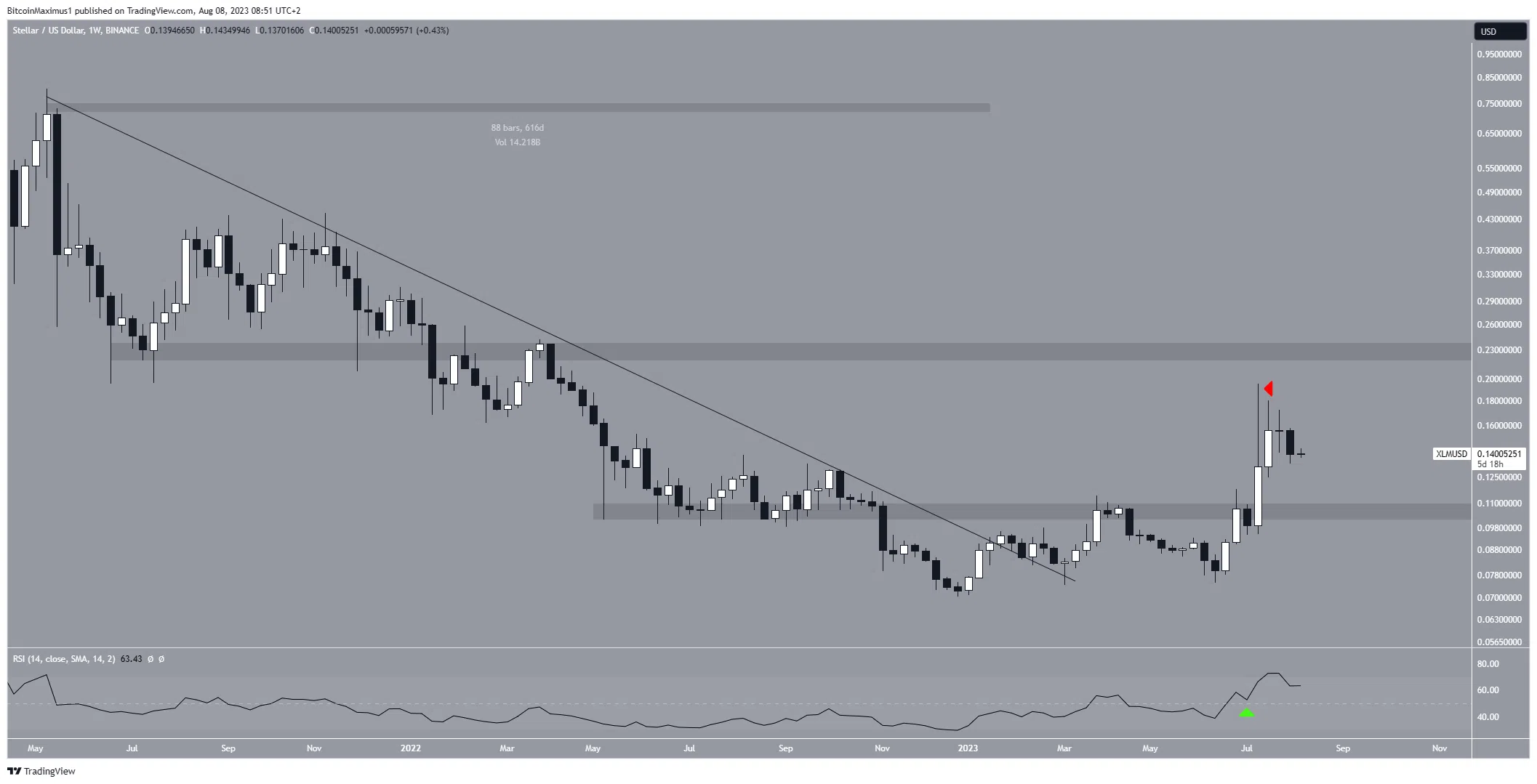 Após esse rompimento, a XLM estabeleceu uma mínima mais alta e confirmou a linha de resistência anterior como um nível de suporte. Isso levou a um novo movimento ascendente para a XLM, que ganhou impulso em junho.