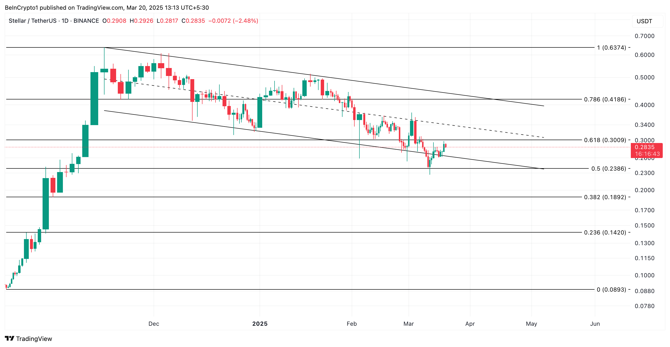 No gráfico diário, a XLM opera dentro de um canal paralelo descendente. A altcoin permanece nesse canal de baixa desde que atingiu o pico de três anos de US$ 0,63 em novembro passado. Agora negociada a US$ 0,28, o preço da criptomoeda caiu 55% desde então.