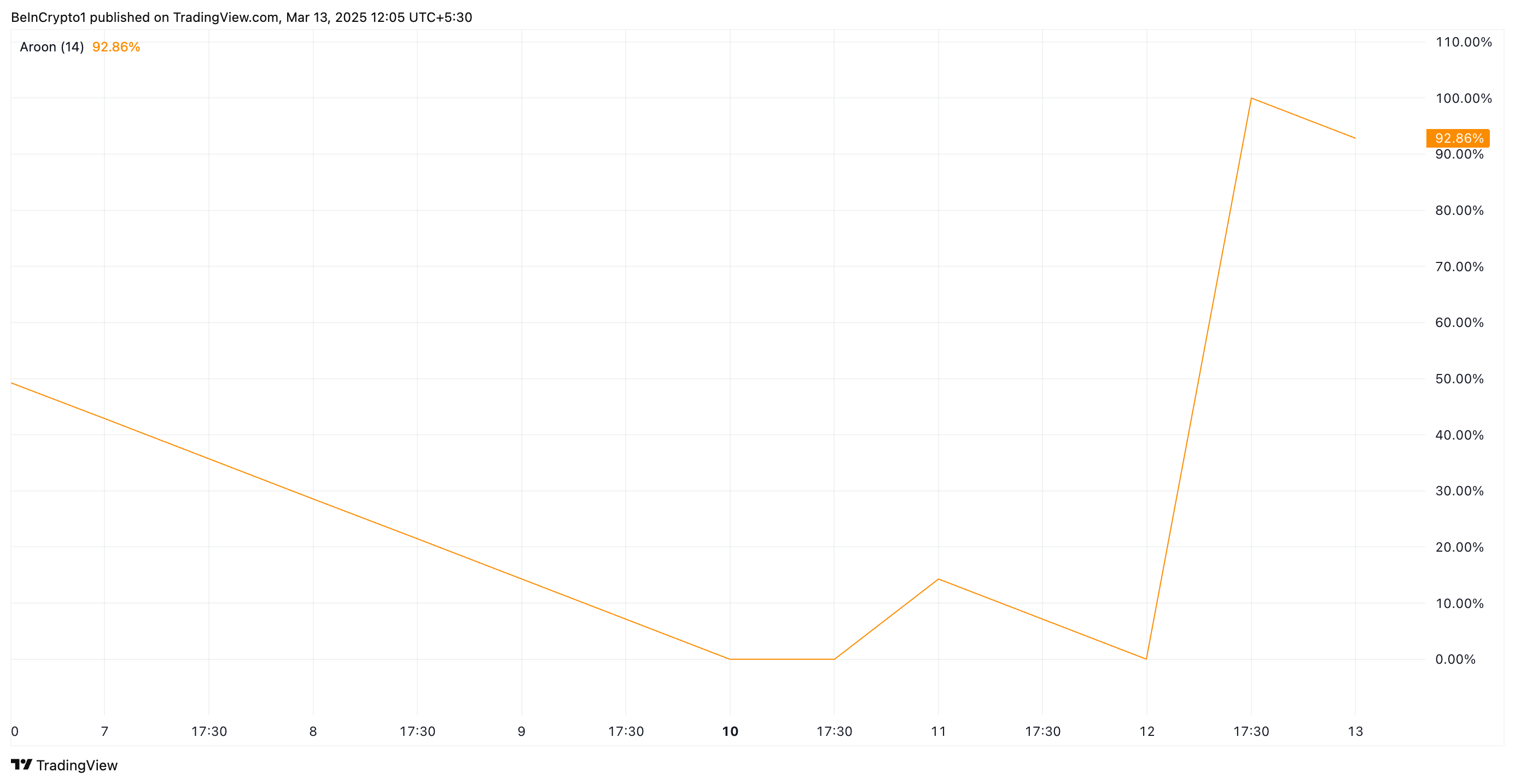 Quando esse indicador está próxima de 100%, isso indica uma forte tendência de alta. A métrica sugere que a IP está consistentemente atingindo novos máximos dentro do período de análise. Isso é verdade para a moeda, que atualmente é negociada a US$ 5,91, seu maior valor desde 8 de março.