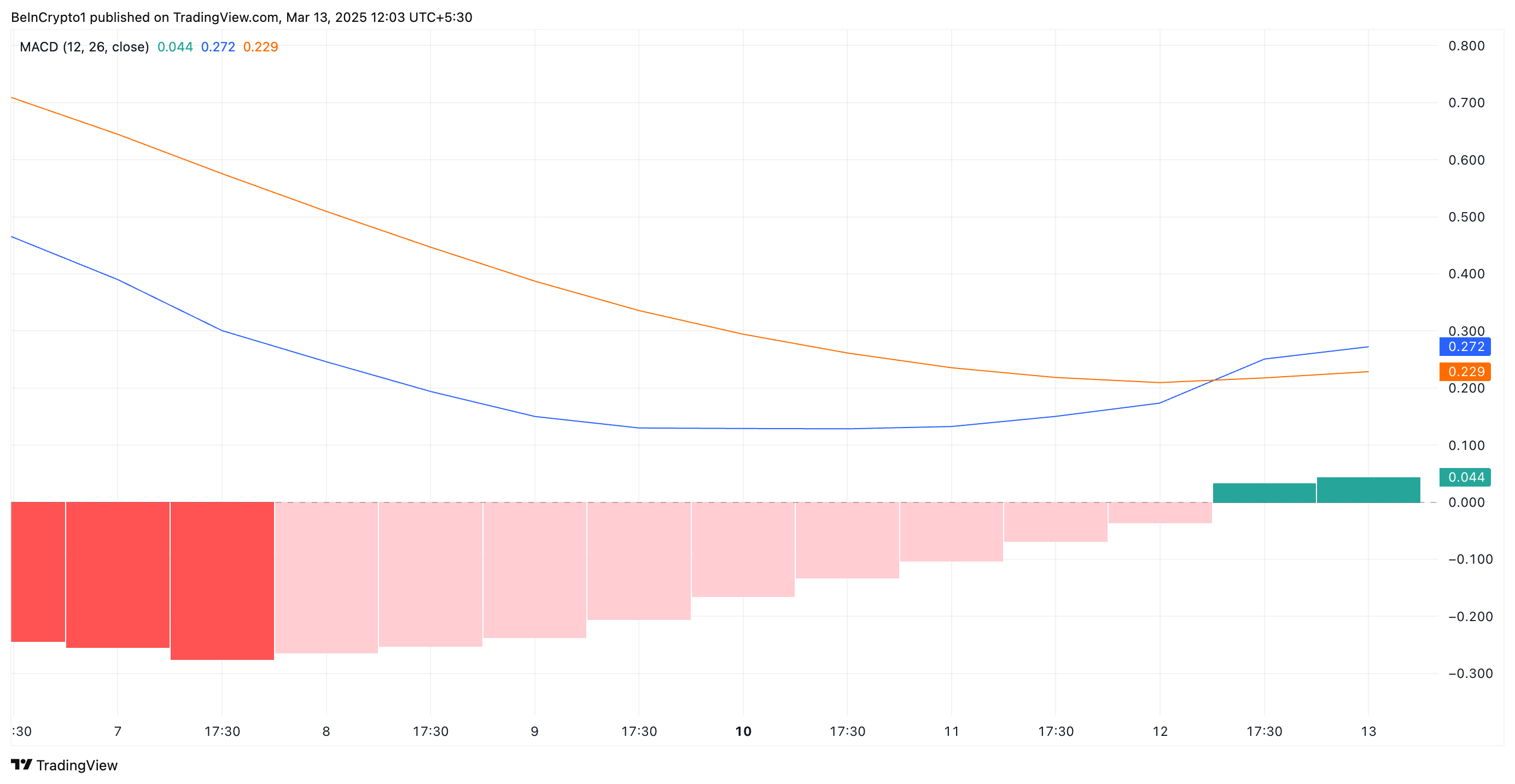 SponsoredApós passar um período prolongado abaixo da linha de sinal (laranja), a linha MACD da altcoin (azul) ultrapassou-a durante a sessão de negociação de quarta-feira (12), exibindo uma barra de histograma verde.