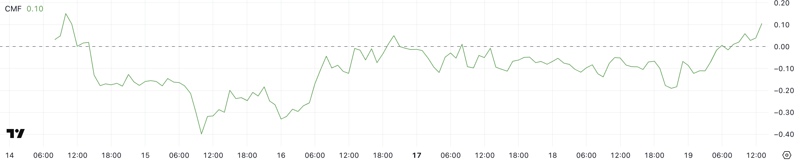 Essa mudança rápida de território negativo para positivo sugere um aumento significativo na pressão de compra após um período de fortes saídas. O CMF mede a acumulação e distribuição ponderada pelo volume de um ativo, ajudando a determinar se o dinheiro está entrando ou saindo do mercado.