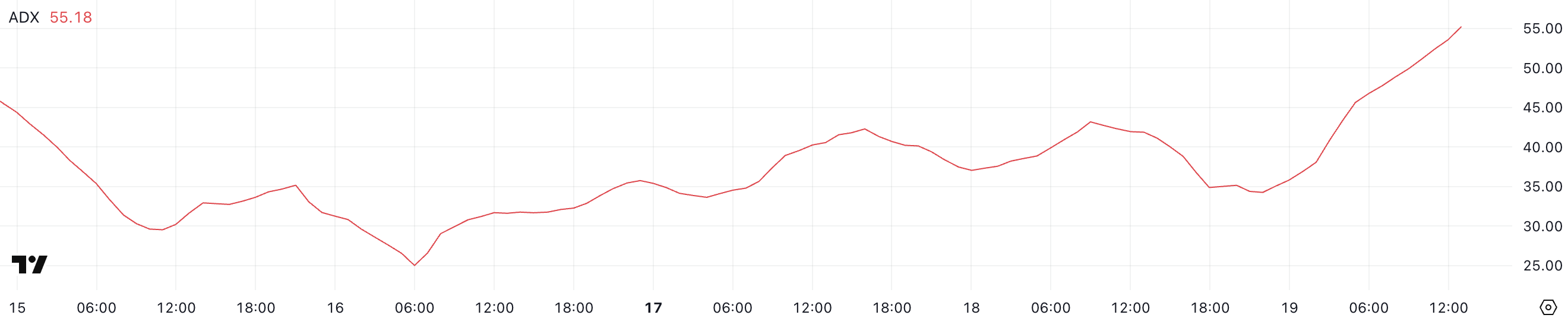 O ADX é usado para medir a força da tendência em uma escala de 0 a 100, com leituras acima de 25 sinalizando uma tendência forte e qualquer valor acima de 50 indicando força extrema da tendência.