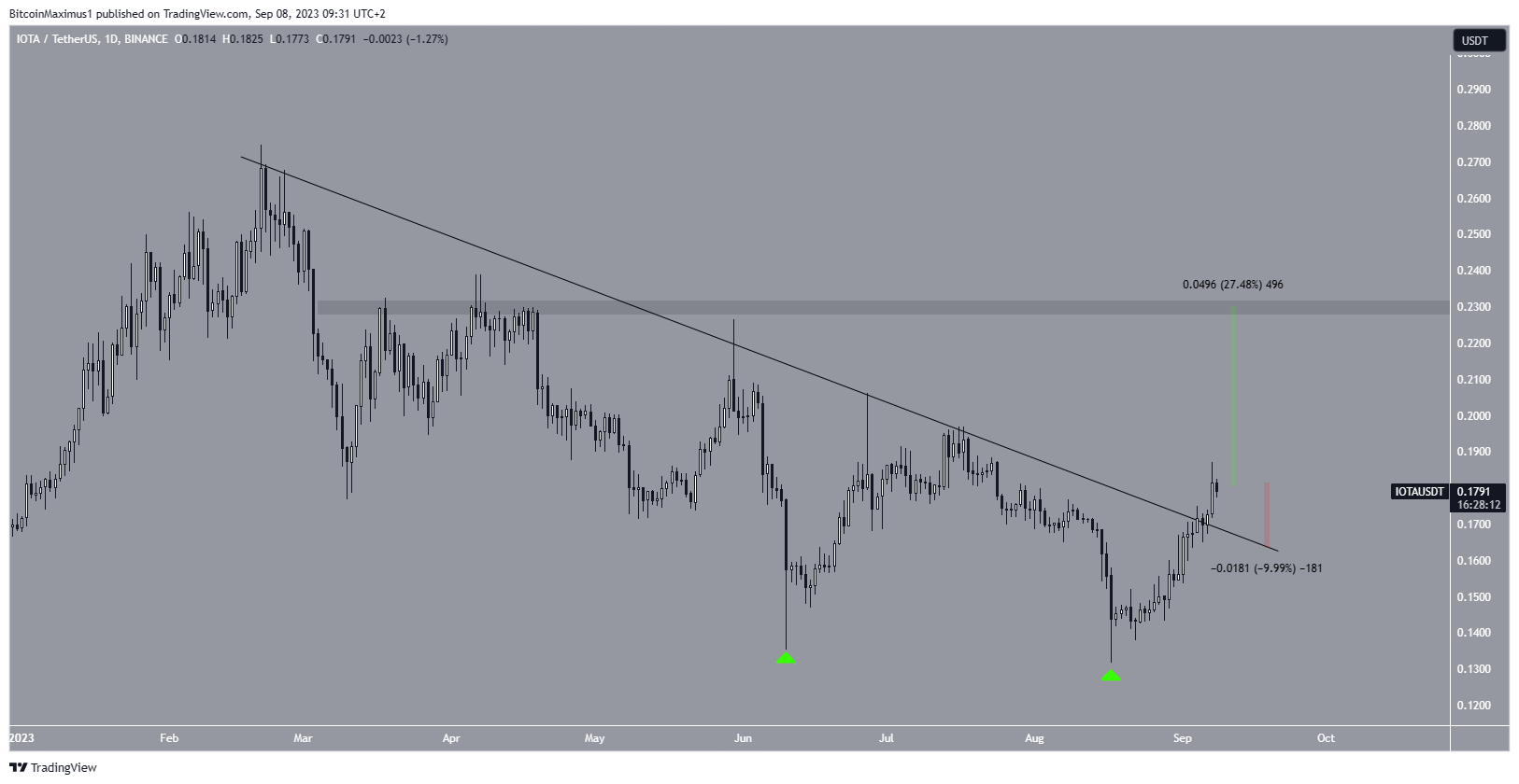 A IOTA criou um padrão de fundo duplo em 10 de junho e 17 de agosto (ícones verdes). O fundo duplo é considerado um padrão de alta, o que significa que leva a rompimentos na maioria das vezes.