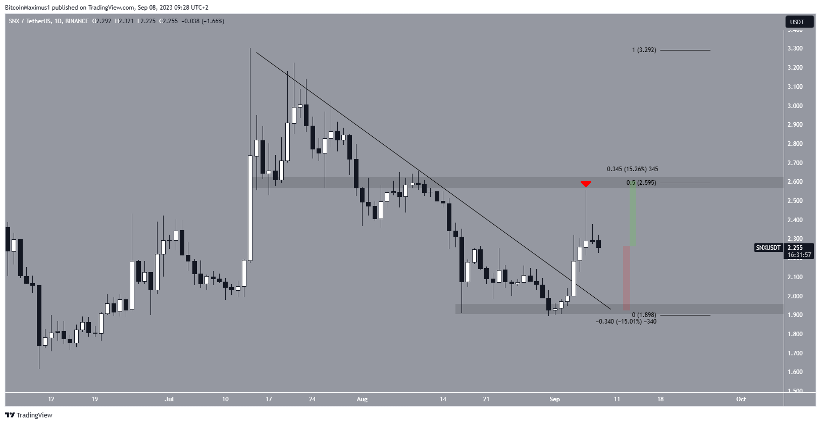 Após o rompimento, o preço atingiu uma máxima de US$ 2,56 em 6 de setembro. Ela foi atingida ligeiramente abaixo do nível de retração de 0,5 de Fibonacci, em US$ 2,60. No entanto, o SNX preço caiu logo depois e está em queda desde então, criando um longo pavio superior (ícone vermelho) no processo. O pavio é considerado um sinal de pressão de venda.