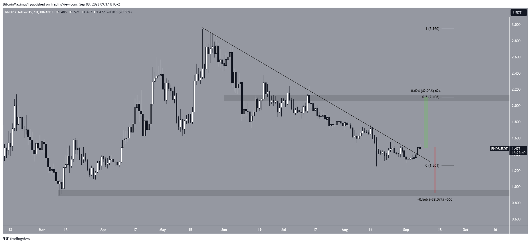 O RNDR caiu abaixo de uma linha de tendência de baixa desde sua máxima anual de US$ 2,95 em 21 de maio. O movimento levou a uma mínima de US$ 1,25 em 17 de agosto.