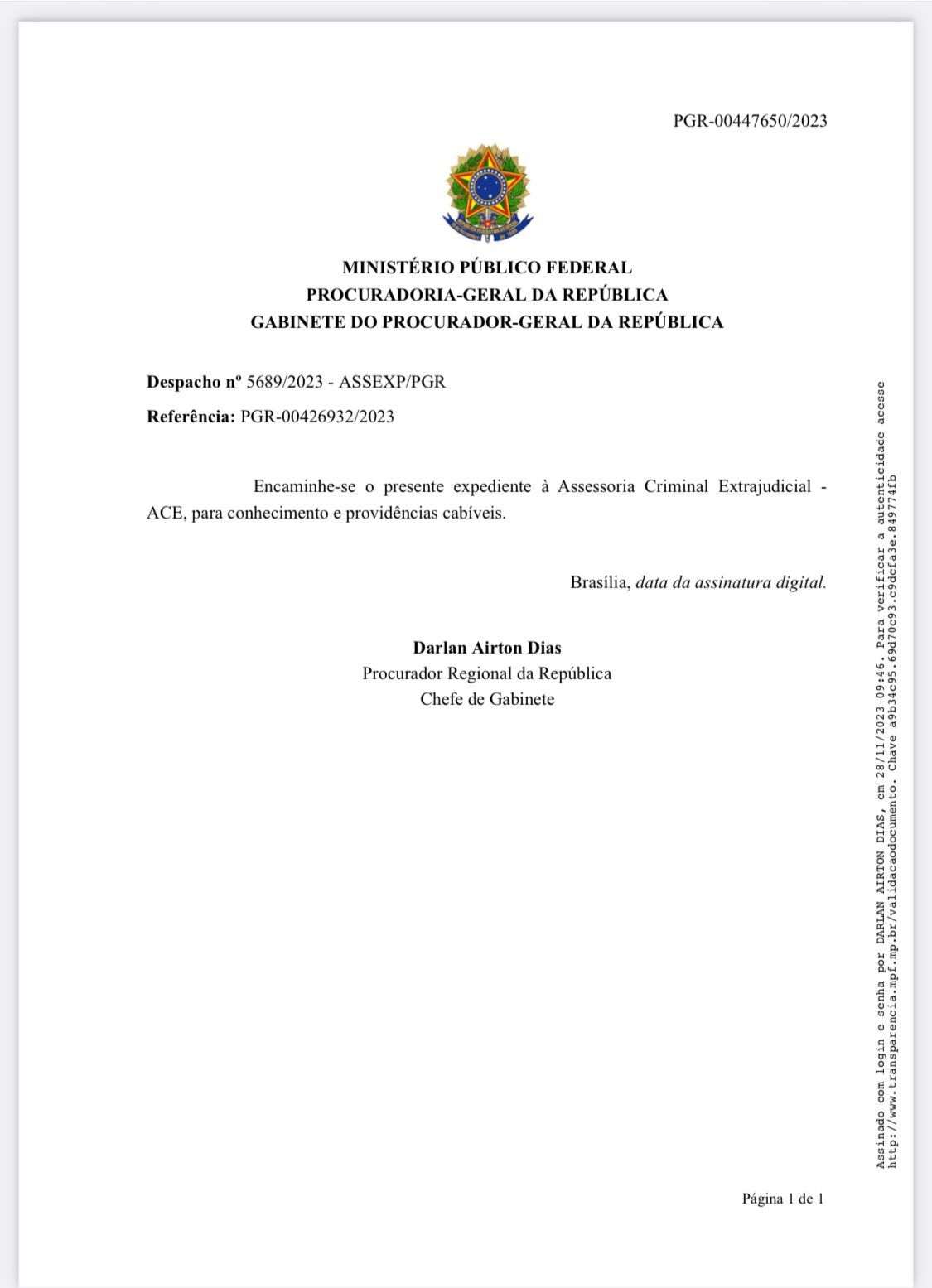 “O caso está em fase de análise preliminar para definição dos próximos passos, o que pode significar instauração de inquérito, arquivamento ou outras medidas cabíveis. Não há prazo para conclusão dessa avaliação inicial.”