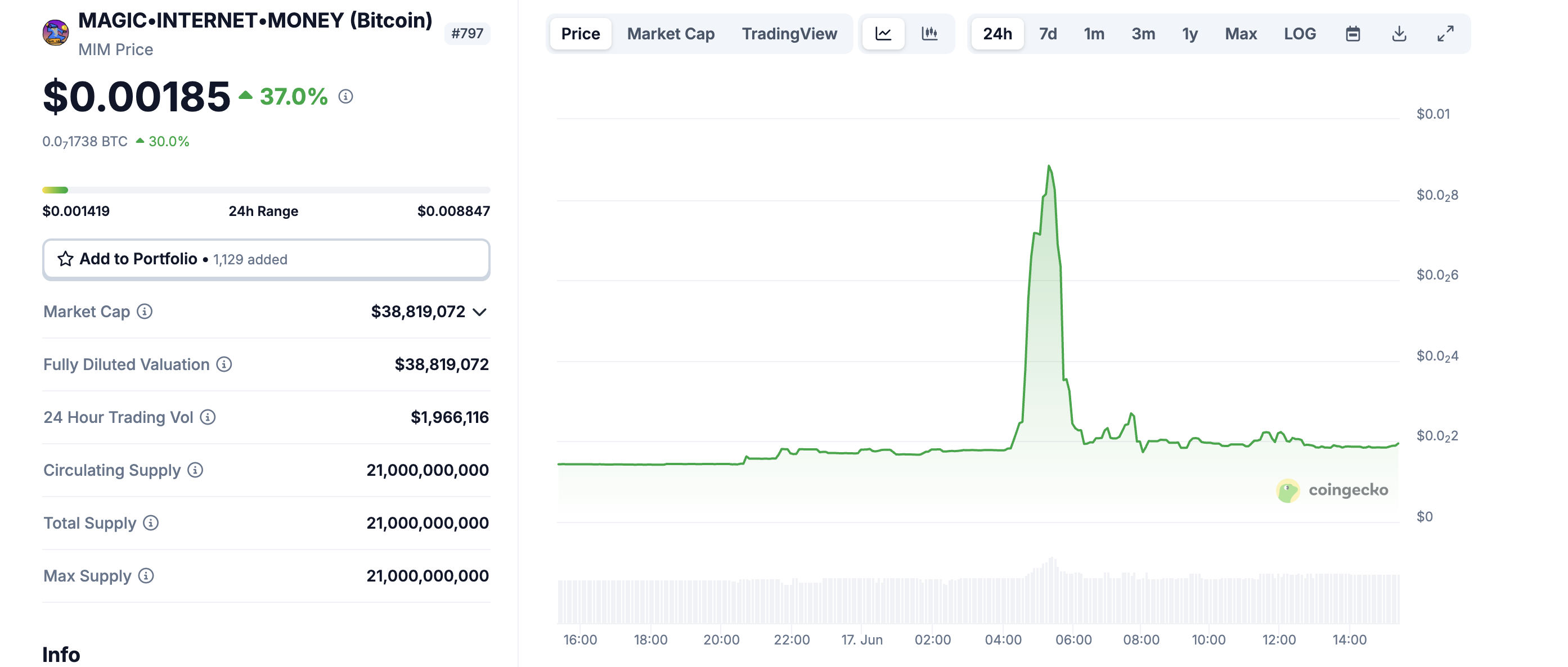 Embora o movimento de preço estivesse relativamente contido, a MIM disparou subitamente nesta segunda-feira (17). A cotação saltou 417,6%, passando de aproximadamente US$ 0,0017 para US$ 0,0088, estabelecendo uma nova máxima histórica (ATH) para a memecoin baseada no Bitcoin.