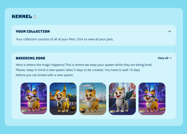 Enquanto aguarda a conclusão do processo de nascimento, o novo animal de estimação será exibido no canil dos usuários com status pendente. Os proprietários dos NFTs também verão uma contagem regressiva mostrando quantos dias faltam para que seu novo animal de estimação apareça.