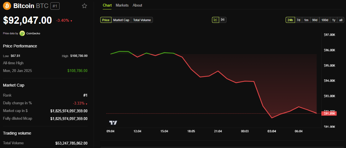 Até a publicação deste texto, o Bitcoin caía 3,4% desde a abertura da sessão de terça-feira (25), sendo negociado por US$ 92.047.