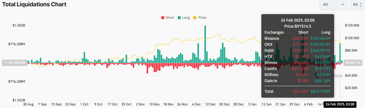 Logo após este relatório, o preço do Bitcoin caiu abaixo do limite de US$ 92 mil. Da mesma forma, os mercados de cripto desabaram, com a capitalização total perdendo até 7% de seu valor. Enquanto isso, dados da Coinglass mostram que o colapso resultou em quase US$ 1 bilhão em liquidações totais na indústria de cripto.