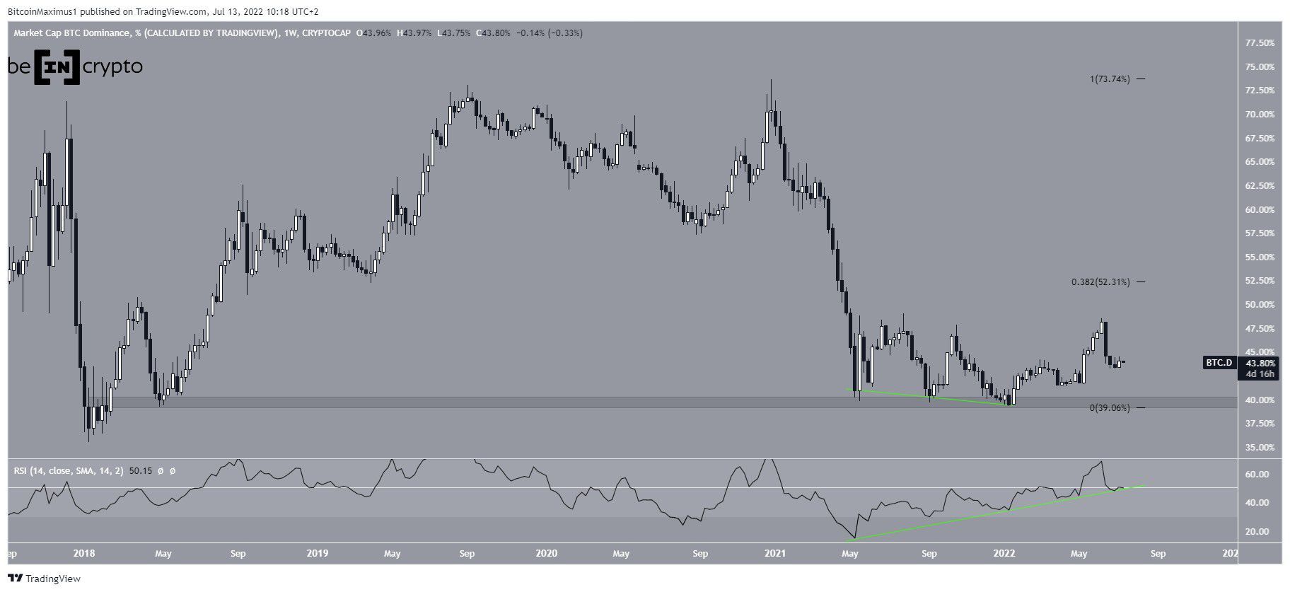 A taxa de dominância do Bitcoin (BTCD) saltou após atingir uma linha de suporte, enquanto o RSI diário gerou uma divergência de alta.