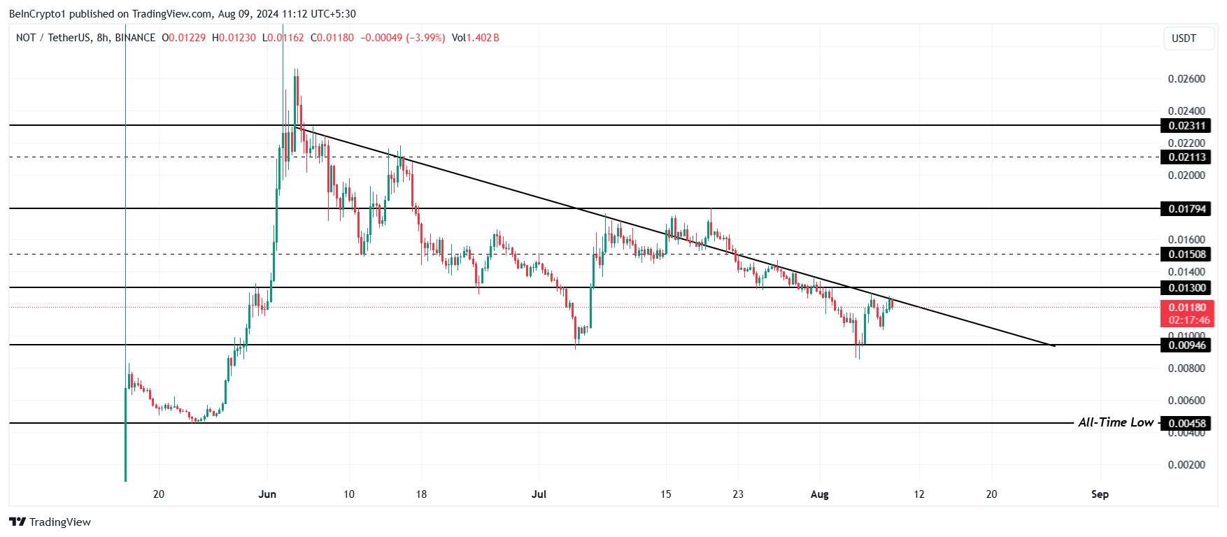 O preço da criptomoeda Notcoin (NOT), do Telegram, está preso em uma tendência de baixa que a mantém sob controle há dois meses.