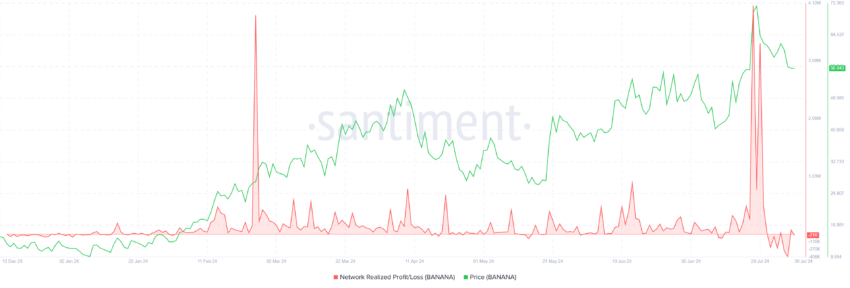 O índice MVRV avalia o lucro e a perda do investidor. Atualmente, o MVRV de 30 dias da BANANA está em -15%, indicando perdas e possível pressão de compra. Nesse sentido, um MVRV entre -7% e -17% geralmente sinaliza o início de altas, marcando-o como uma zona de oportunidade de acumulação.