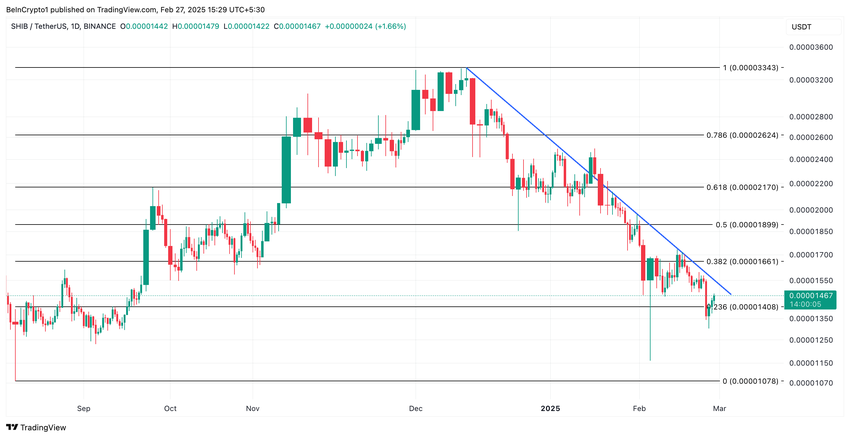 De acordo com leituras de sua ferramenta de Retração de Fibonacci, se esses sinais otimistas persistirem, a memecoin pode romper a linha de tendência descendente que manteve seu preço em queda desde o início de dezembro. Uma quebra desse nível de resistência de longo prazo pode impulsionar o preço do SHIB para US$ 0,0000166.