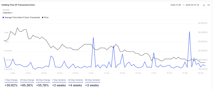 Dados on-chain revelaram um aumento no tempo de posse de todas as moedas SHIB transacionadas nos últimos sete dias. Segundo a IntoTheBlock, a métrica subiu 31% durante esse período.