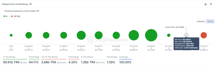 Além disso, uma parte da oferta de TRX está aguardando um gatilho de lucro, que, ao que parece, não ocorrerá tão cedo. Cerca de 1,36 bilhão de moedas compradas na faixa de US$ 0,1165 a US$ 0,1205 estão na incerteza e podem cair novamente no território de perdas.