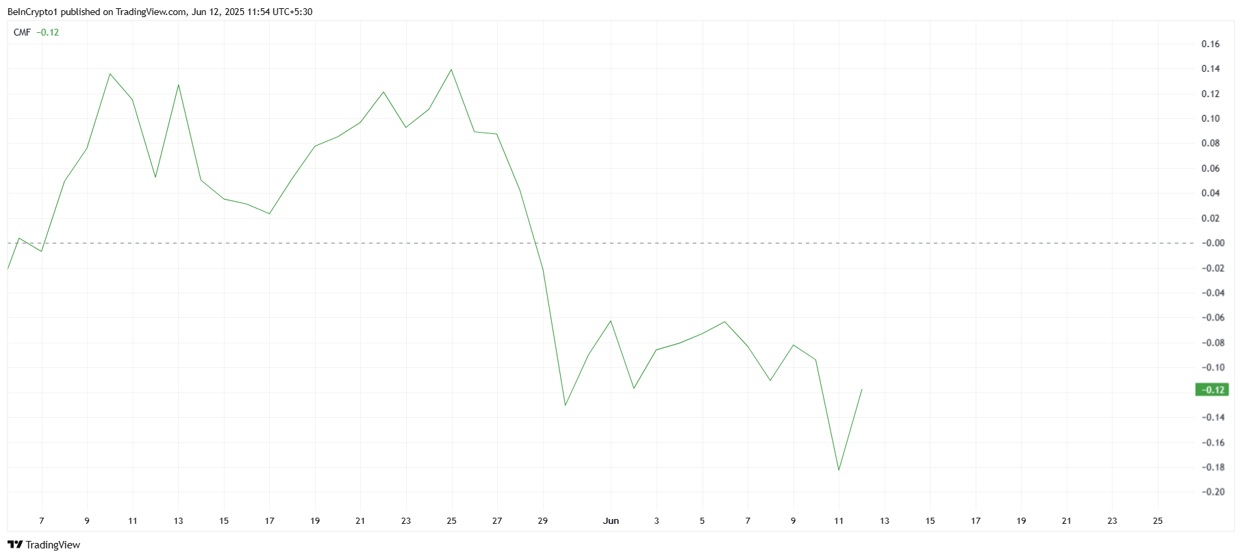 O indicador Chaikin Money Flow (CMF) entrou em território negativo, permanecendo abaixo da linha zero. Isso indica que os volumes de saída superam os de entrada, reforçando a fraqueza do interesse comprador. A desconfiança quanto à recuperação da HBAR tem pressionado ainda mais a cotação.