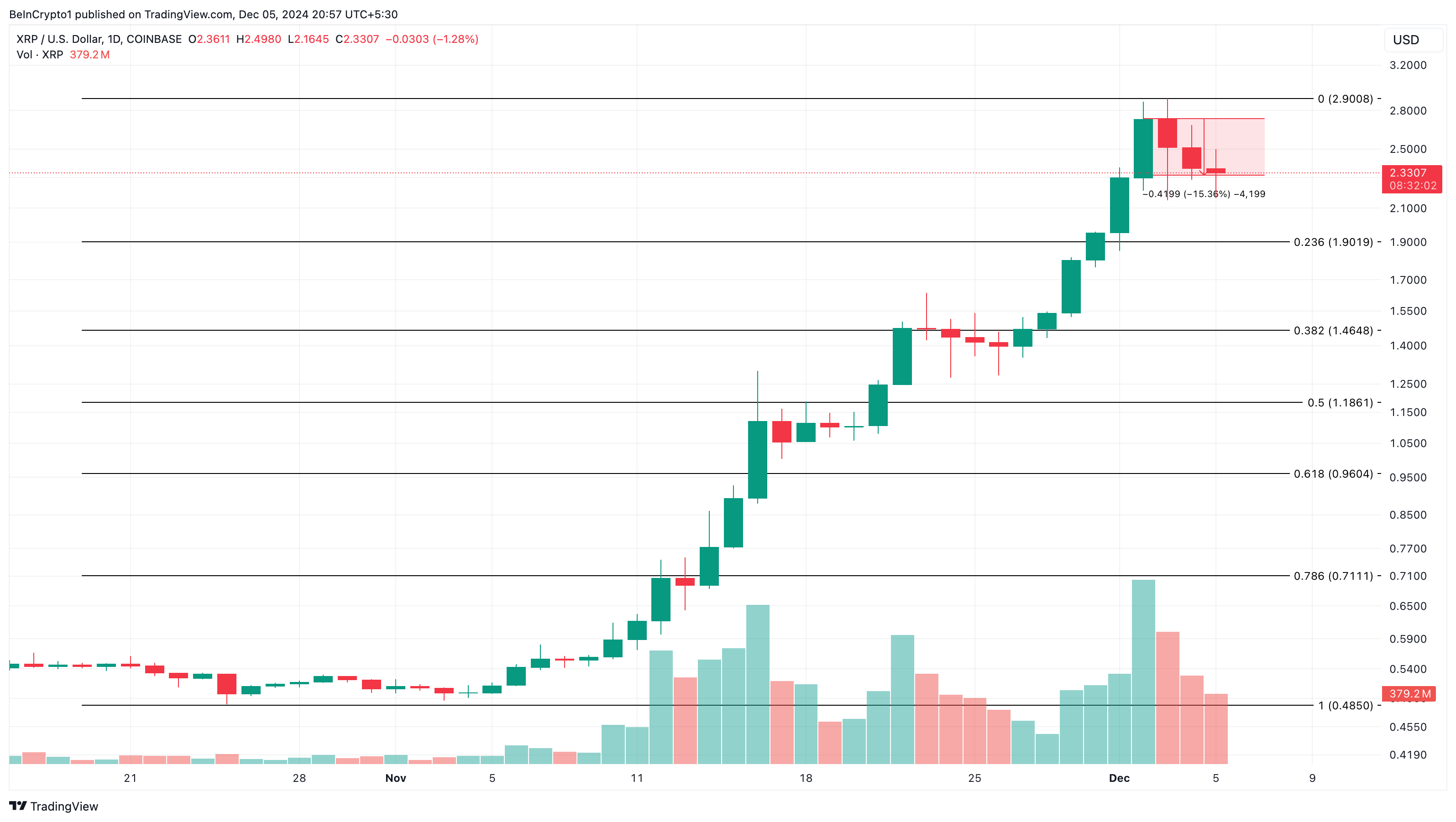 No gráfico diário, o XRP apresentou três velas vermelhas consecutivas, indicando pressão de venda sobre a altcoin. Uma análise mais detalhada do gráfico mostra que o volume de negociação da criptomoeda diminuiu.