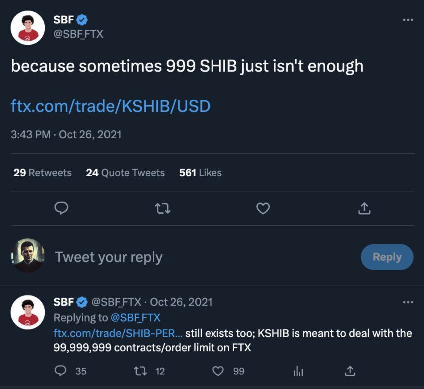 Na mesma mensagem, ele destacou que essa ação marcou o teto absoluto para a criptomoeda meme, mas a “SHIB imediatamente começou a despencar, para nunca mais se recuperar”. Ele ainda compartilhou uma curiosa mensagem postada pelo ex-CEO da FTX na época.